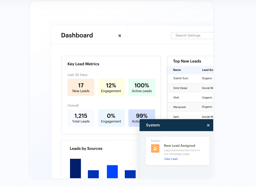 Lead management: Automatically captures leads and contacts from multiple sources like websites, ads and social media