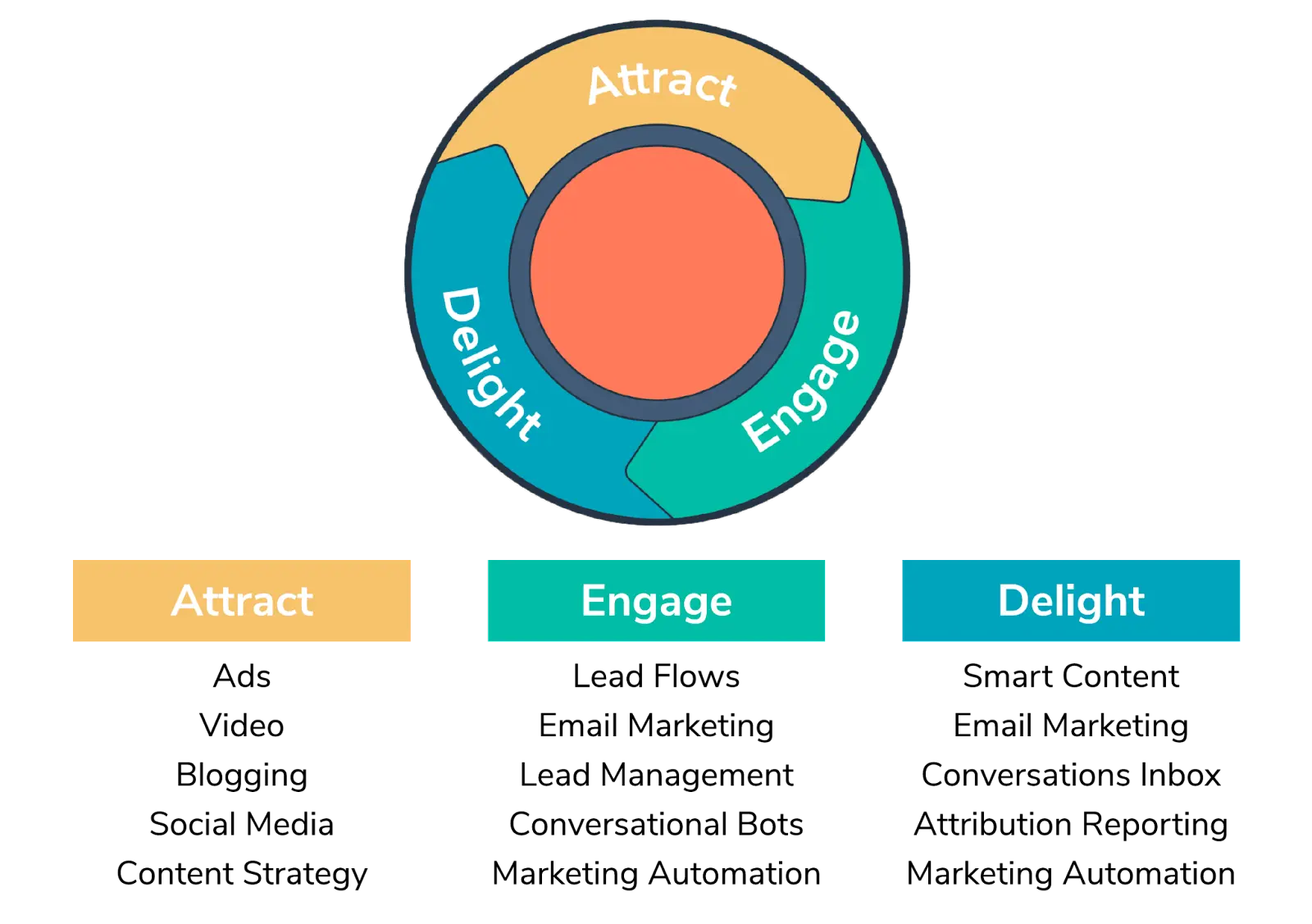 When your flywheel is based on the inbound methodology, your marketing, sales and services can add force and eliminate friction throughout all three phases: attract, engage and delight.