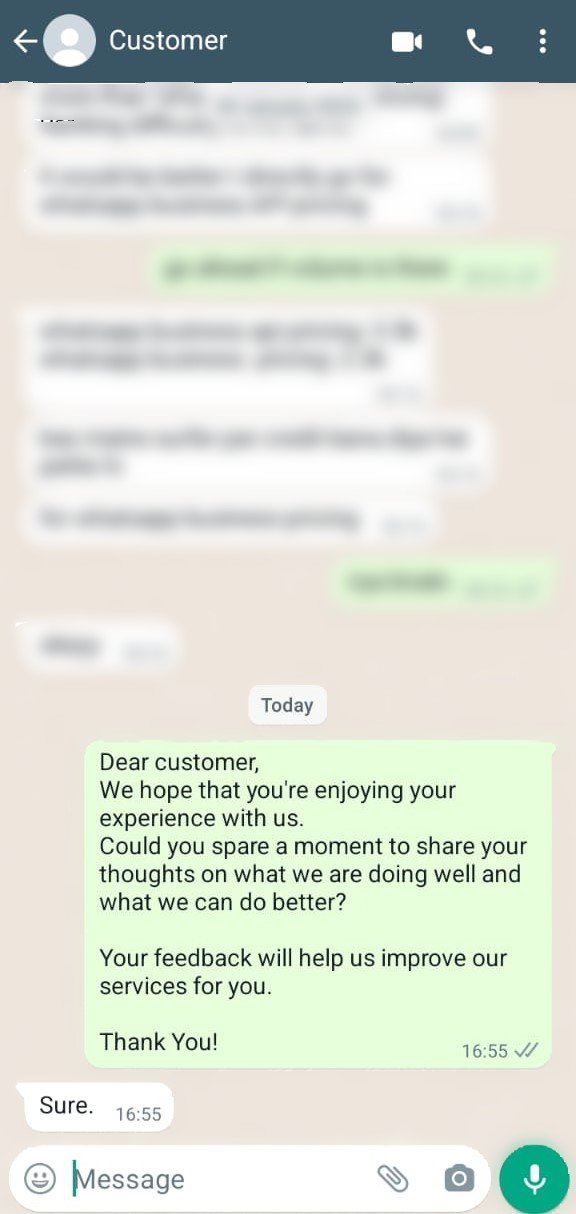 Collecting customer feedback on WhatsApp is easy. All you have to do is send a simple message encouraging customers to share their thoughts on the product or service they purchased.